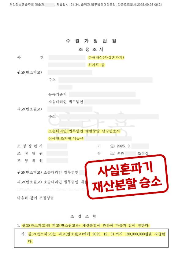 그 결과, 재판부는 법무법인 대한중앙의 주장을 모두 인정하고 A씨에게 재산분할 해줄 것을 정하였습니다. 처음에 B씨가 주장한 손해배상을 해주지 않고 오히려 재산분할을 받을 수 있게 되었습니다.